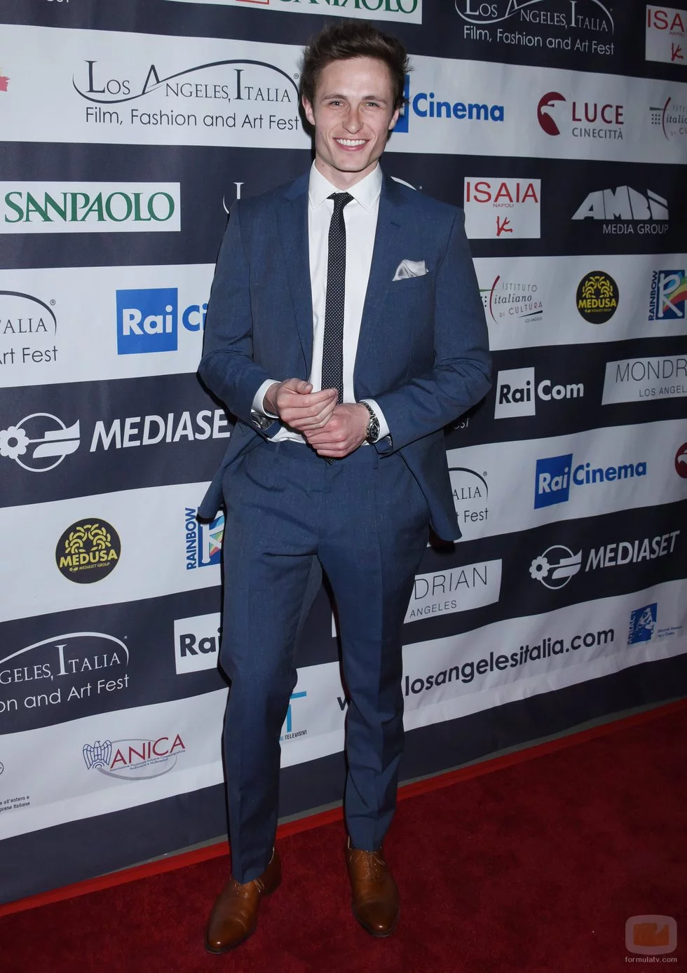 El actor británico, que ha participado en "Florence Foster Jenkins" y 'Pretty Little Liar: The perfectionists', posa delante de los medios de un evento.