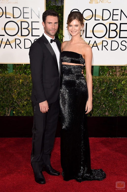 El cantante de Maroon 5, Adam Levine, con su pareja Behati Prinsloo a su llegada a la alfombra roja de los Globos de Oro 2015 en Los Angeles.