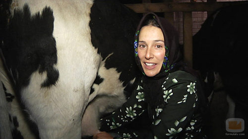 Adela Ucar ordeñando una vaca en '21 días: Como hace 100 años'.