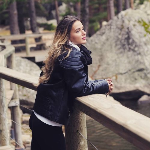 Adelina Seres, de 'La isla de las tentaciones', luce una chaqueta de cuero mientras permanece apoyada en la pasarela de un parque natural.