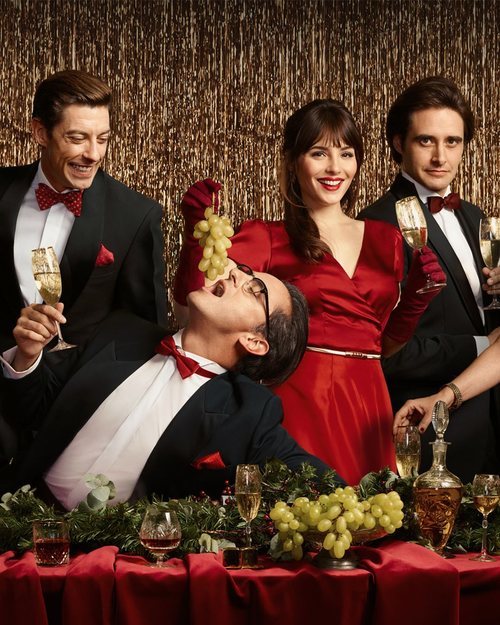 Adrián Lastra (Pedro Infantes), Asier Etxeandia (Raúl de la Riva), Andrea Duro (Marie Leduc) y Llorenç González (Jonás Infantes), parte del elenco de 'Velvet colección', posan juntos en el cartel del final de la serie.