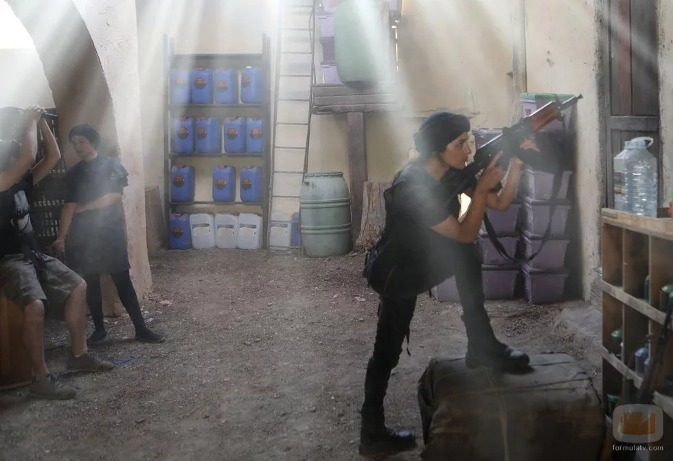 Folch, de fondo con el equipo de rodaje, interpreta a una joven convertida al Islam llamada Montse en una escena junto a la sargento Martina Ibáñez, interpretada por Paula Echevarría, en 'Los nuestros 2'.