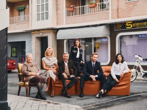Herminia (María Galiana), Merche (Ana Duato), Antonio (Imanol Arias), María (Carmen Climent), Toni (Pablo Rivero) e Inés (Irene Visedo) en la plaza de San Genaro.