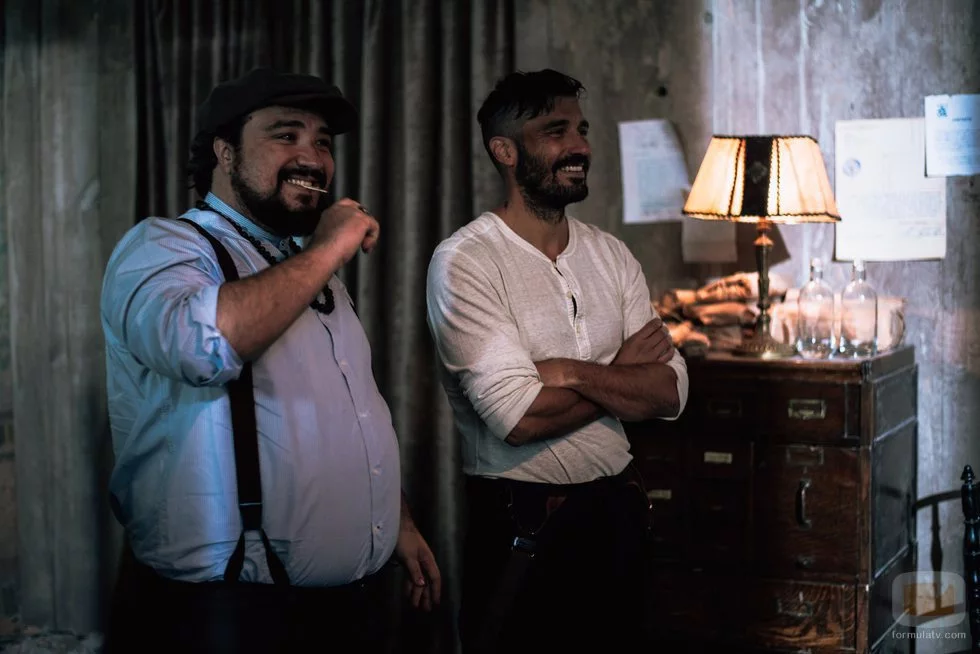 Ricardo, sonriente de brazos cruzados, y Peke, con un palillo en la boca, en una de las primeras imágenes lanzadas por TVE de la ficción.