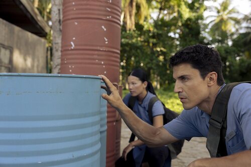 Saibon Wang y Álex González aparecen en una foto del capítulo 1x03 de la serie 'Ladrones: la tiara de Santa Águeda'.