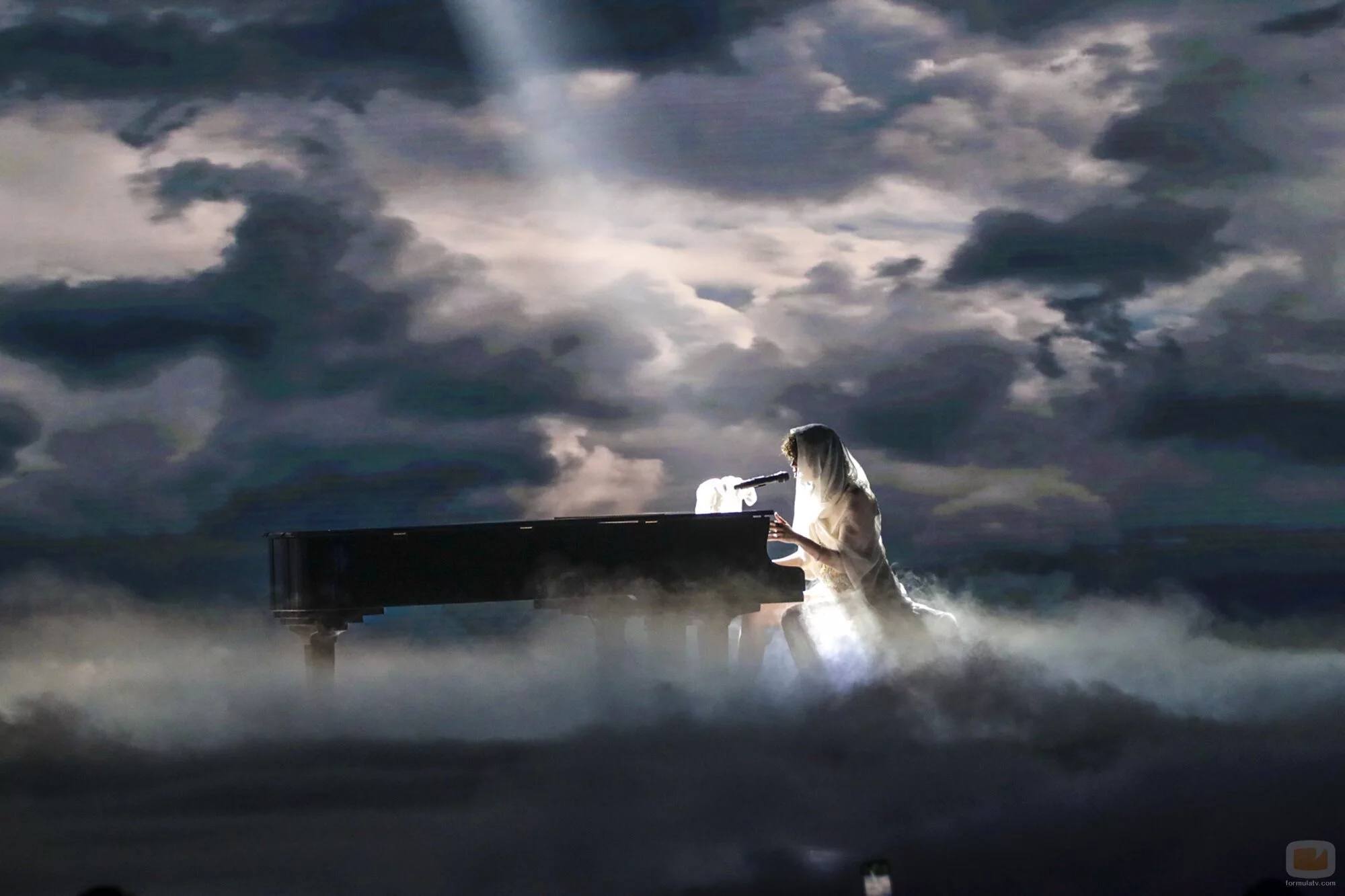 La artista arrancó su actuación al ritmo de "Yo quisiera" con un ambiente íntimo, rodeada de una tormenta y luciendo un velo.