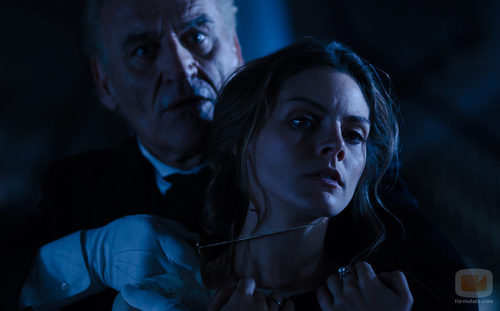 Alicia amenazada por Benjamín, el asesino del cuchillo en 'Gran Hotel'.