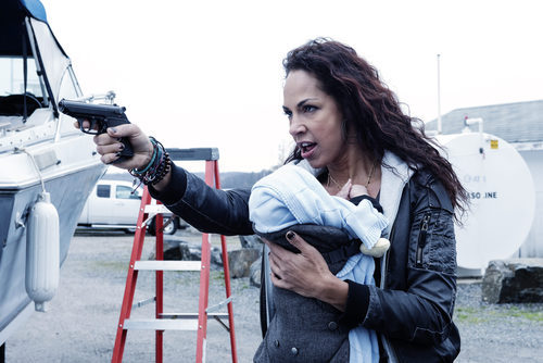 La actriz Amanda Brugel que da vida a Sita Petronelli en 'Eyewitness', empuña un arma mientra sujeta un bebé contra su pecho.