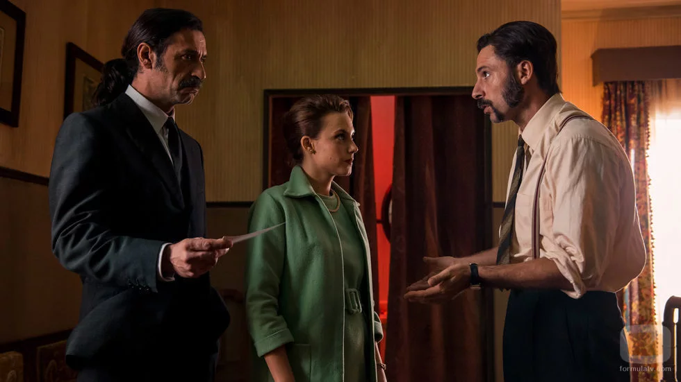 Una de las escenas del primer episodio en el que aparecen Amelia Folch (Aura Garrido), Alonso de Entrerríos (Nacho Fresneda) y Pacino (Hugo Silva) discutiendo como salvar la situación.