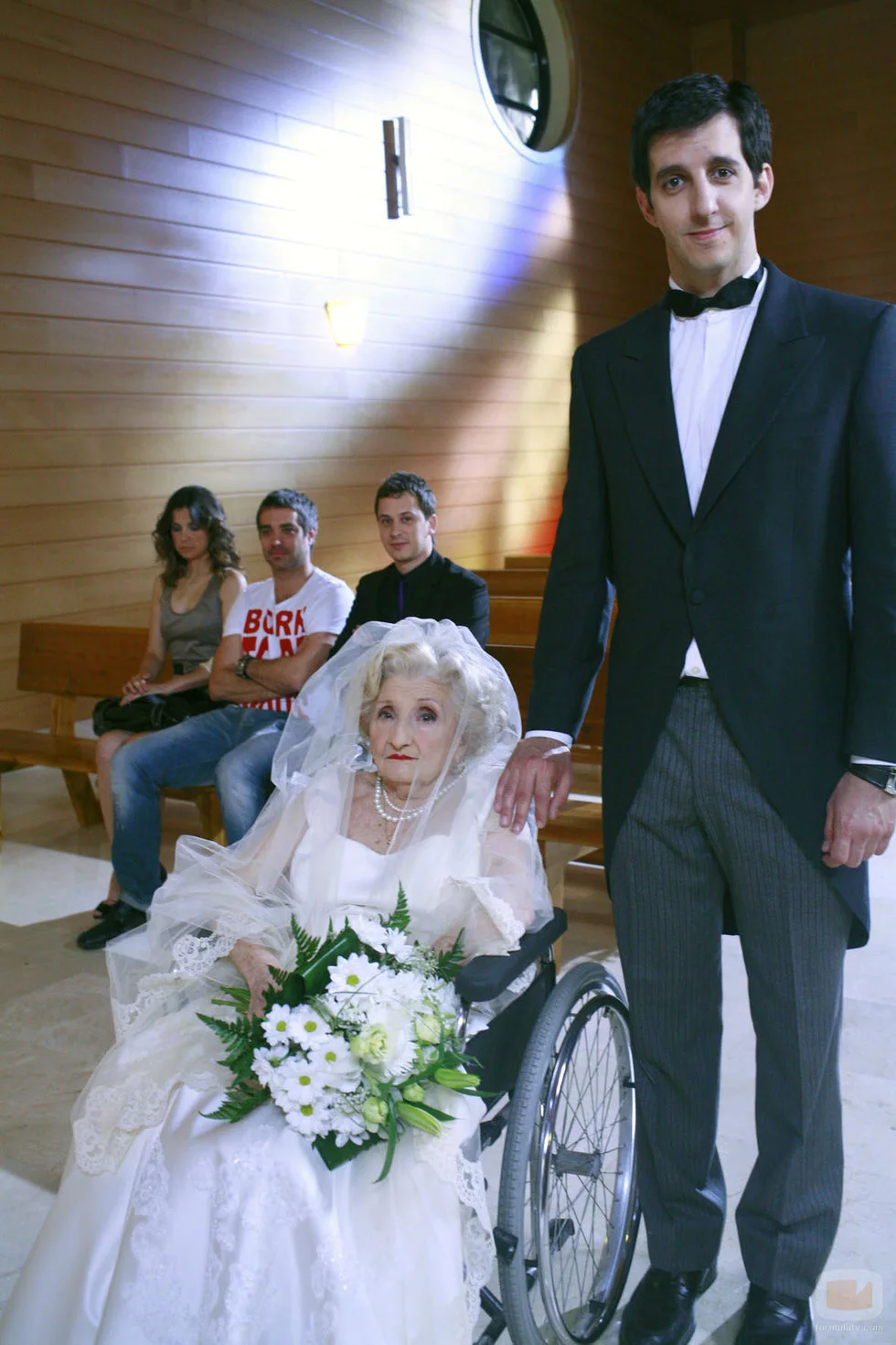 La actriz Amparo Pachecho junto al actor Guillermo Ortega en un capítulo de 'La que se avecina' en el que Amparo es la novia de la boda.
