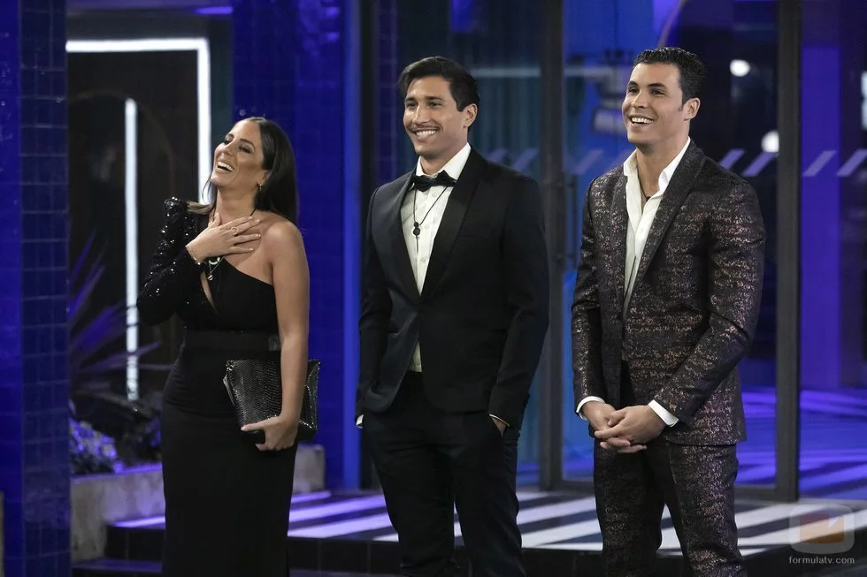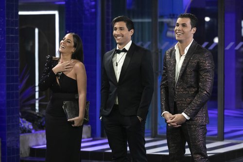 Anabel Pantoja, Gianmarco Onestini y Kiko Jiménez, finalistas de 'El tiempo del descuento', antes de saber qué había decidido la audiencia, que proclamó ganador al italiano.