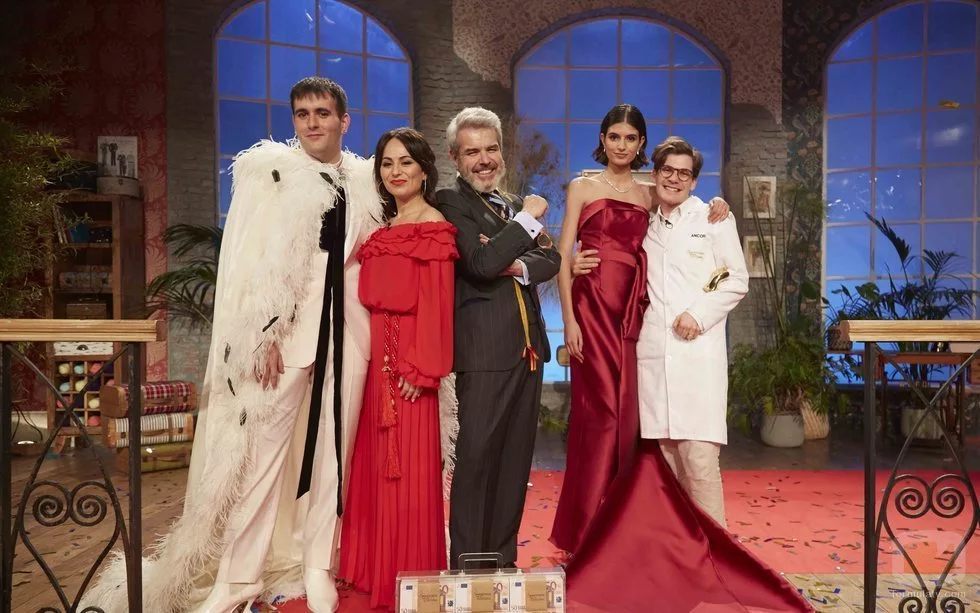 Ancor posa con el jurado de 'Maestros de la costura', Lorenzo Caprile, María Escoté y Palomo Spain, y la modelo que porta su diseño final.
