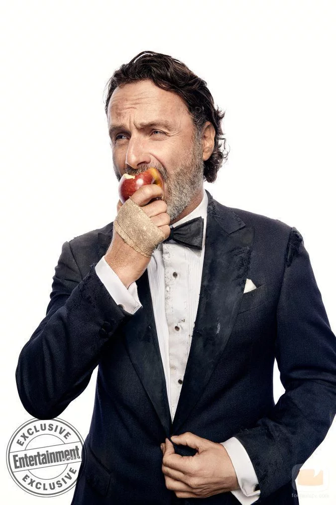 Andrew Lincoln (Rick Grimes) muerde una manzana en la fotografía que festeja los 100 capítulos de 'The Walking Dead'.