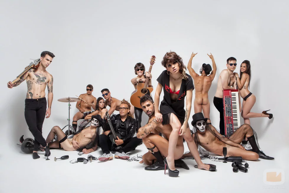Angy, rodeada de un grupo de música desnudo