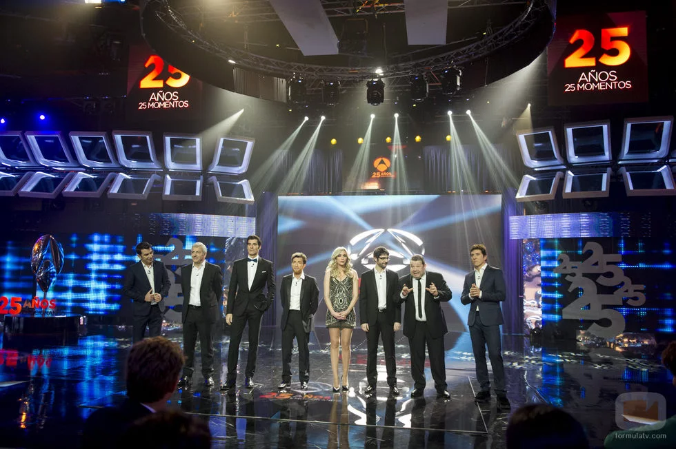 Posado de Arturo Valls, Carlos Sobera, Jorge Fernández, Pablo Motos, Anna Simón, Juanra Bonet, Alberto Chicote y Manel Fuentes en la Gala del 25 Aniversario de Antena 3.
