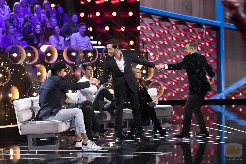 Antonio David Flores da la mano a Kiko Jiménez, mientras que Jorge Javier Vázquez tira de él durante la Gala 13 de 'GH VIP 7'.