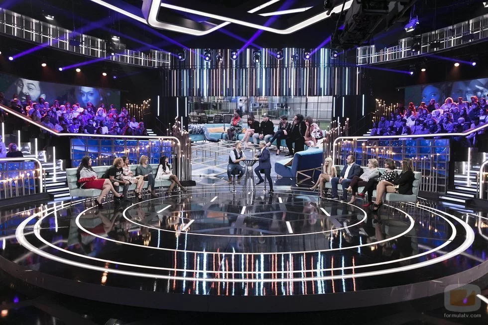 Antonio Tejado frente al plató de 'GH Dúo', con los concursantes expulsados y los defensores, en la Gala 11 del programa.