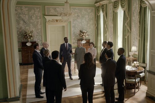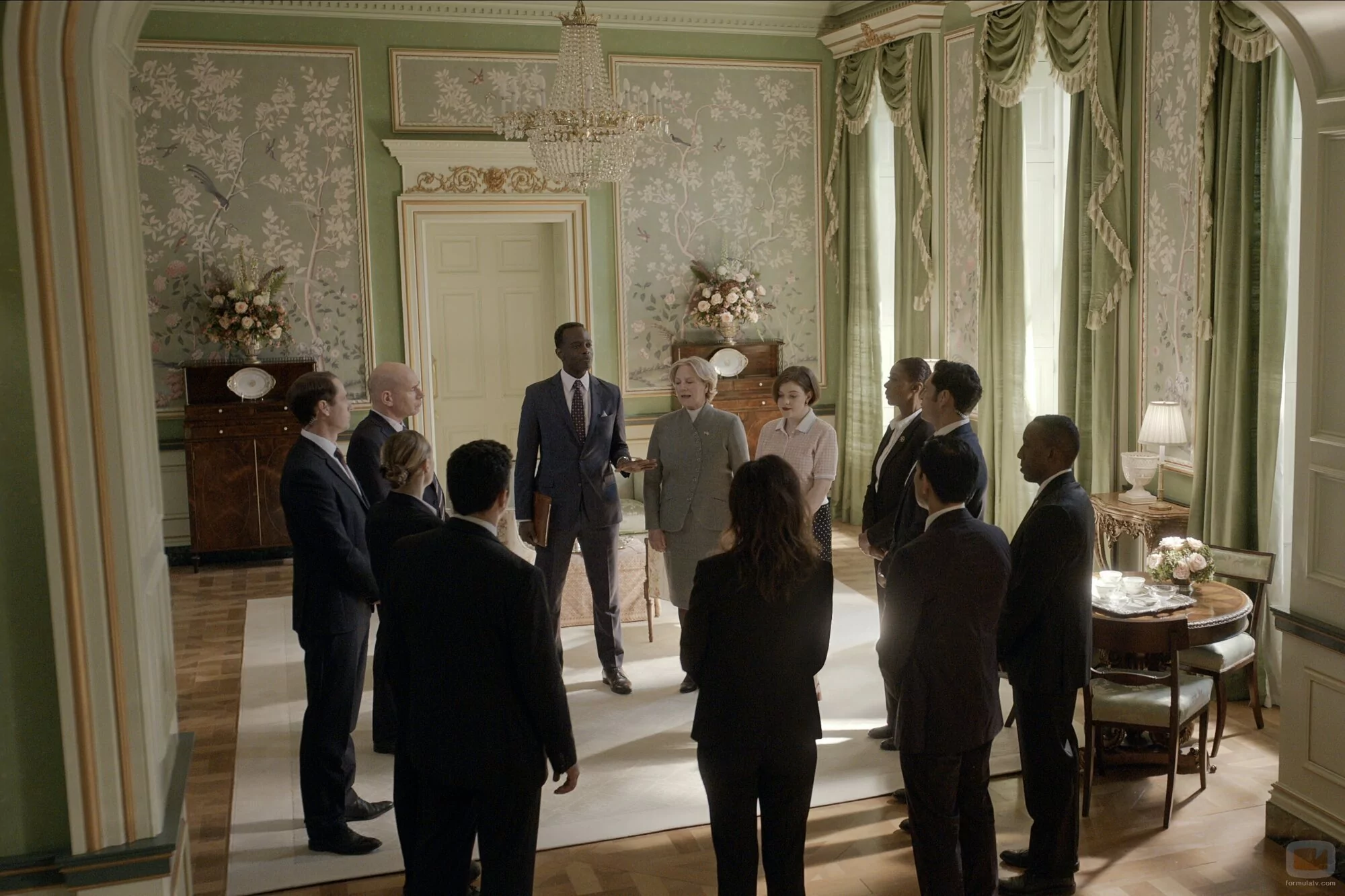 Ato Essandoh, Georgie Henley y Penny Downie aparecen en una escena promocional del episodio 3x04 de la serie 'La diplomática'.