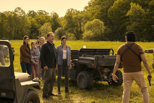 Arnold Schwarzenegger, Monica Barbaro y Patrick Garrow aparecen en una imagen del episodio 1x02 de la serie 'FUBAR'.