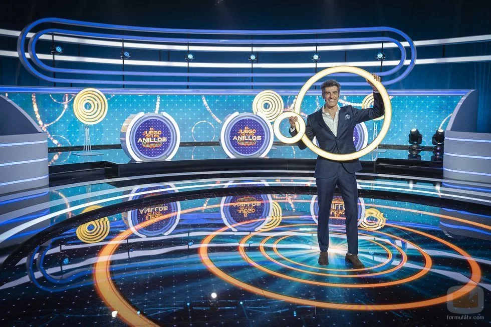 Jorge Fernández posando con varios anillos en el amplio plató de 'El juego de los anillos', el concurso de Antena 3.