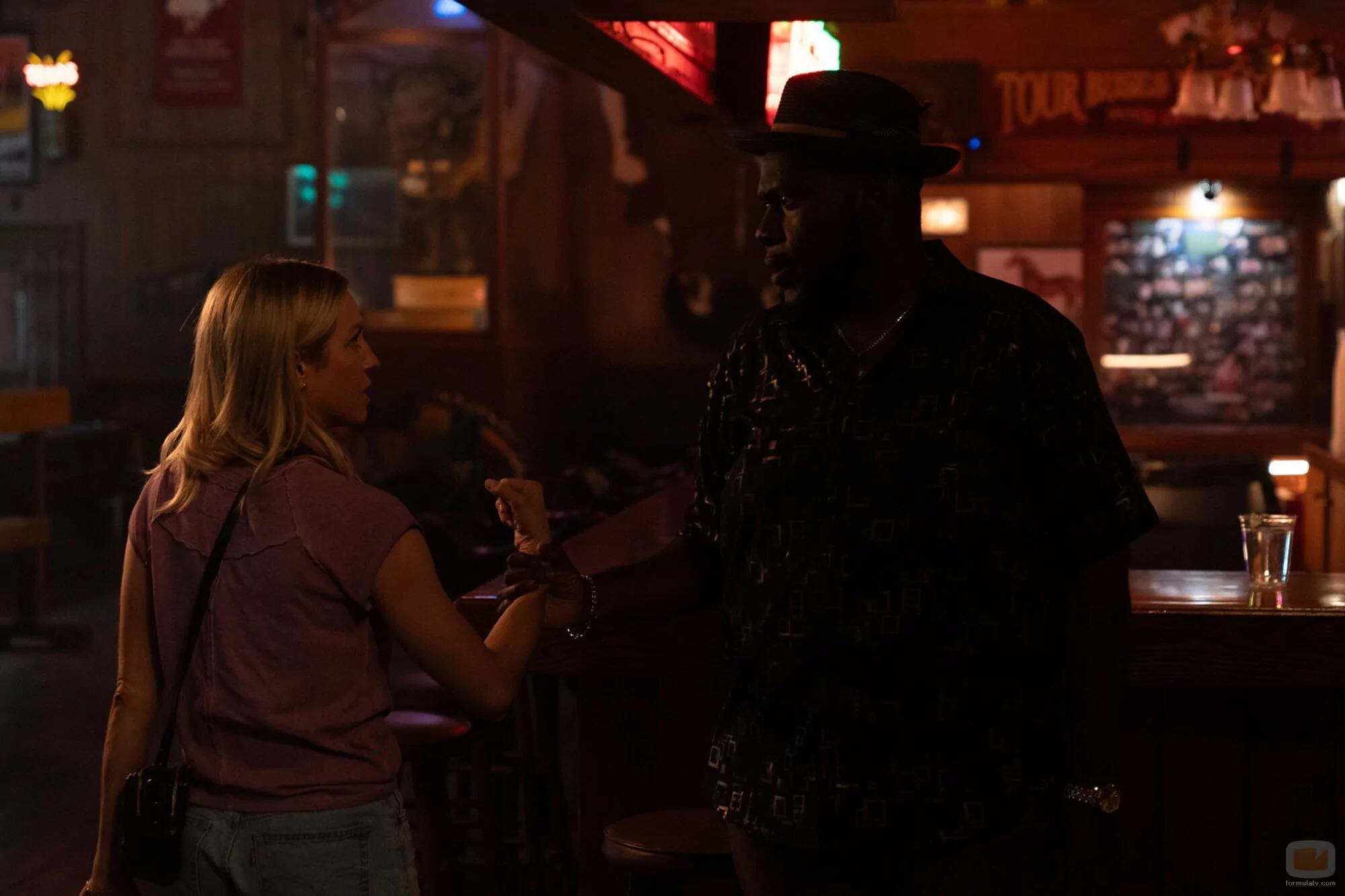 Brittany Snow y Atkins Estimond aparecen en una foto promocional del capítulo 'La decisión de Sophie' de la serie 'Las esposas cazadoras'.