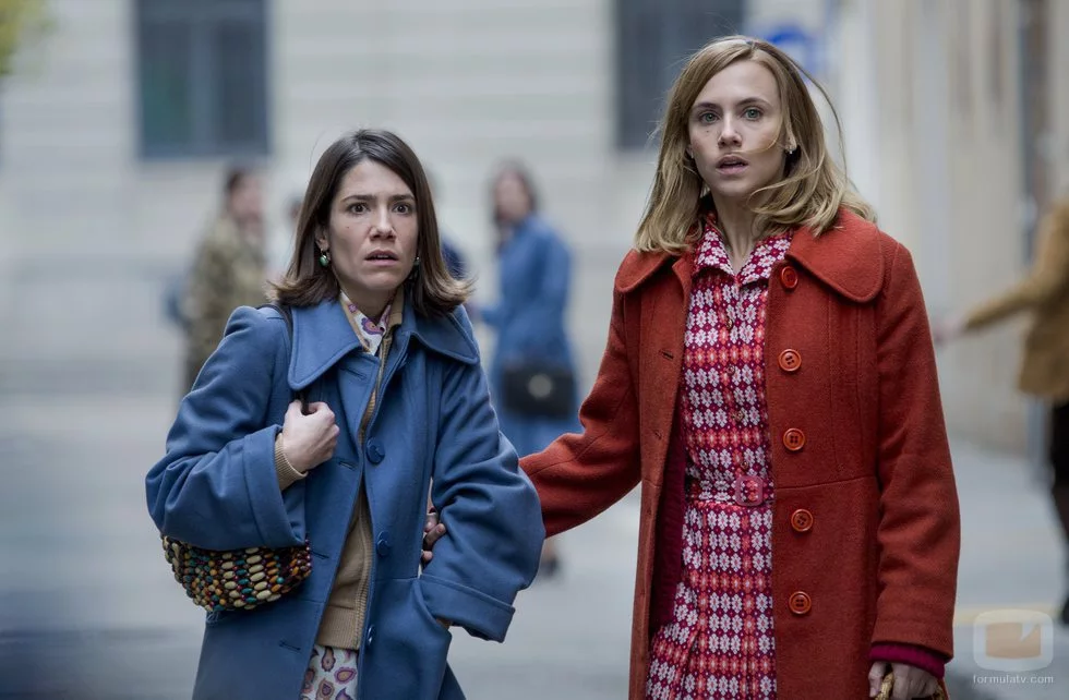 Aura Garrido y Bruna Cusí en 'El día de mañana' caracterizadas de sus personajes Carme Román y Lali. Se encuentran sorprendidas mirando algo.