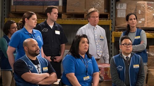 Kaliko Kauahi, Mariana Tosca, Mark McKinney, Jon Barinholtz, Nico Santos, Colton Dunn y Lauren Ash aparecen en una escena del capítulo 3x22 de la serie 'Superstore'.