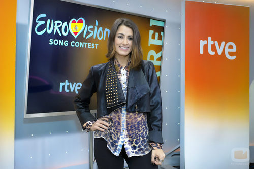 Barei muy sonriente frente a los medios en la rueda de prensa de RTVE