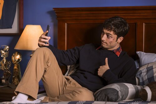 El intérprete Benito Skinner (Benny) en una imagen del capítulo 1x07 de 'Overcompensating' con fecha de estreno el Jueves, 15 de Mayo de 2025.
