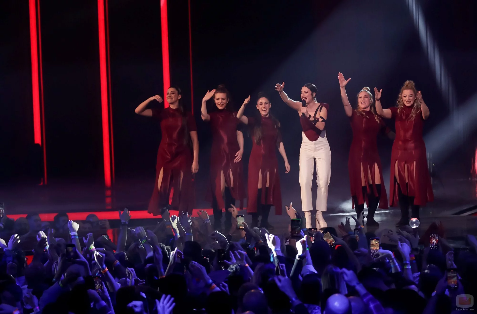 La cantante realiza la coreografía de "Eaea" junto a sus bailarinas, palmeras y coristas en el Benidorm Fest 2023.