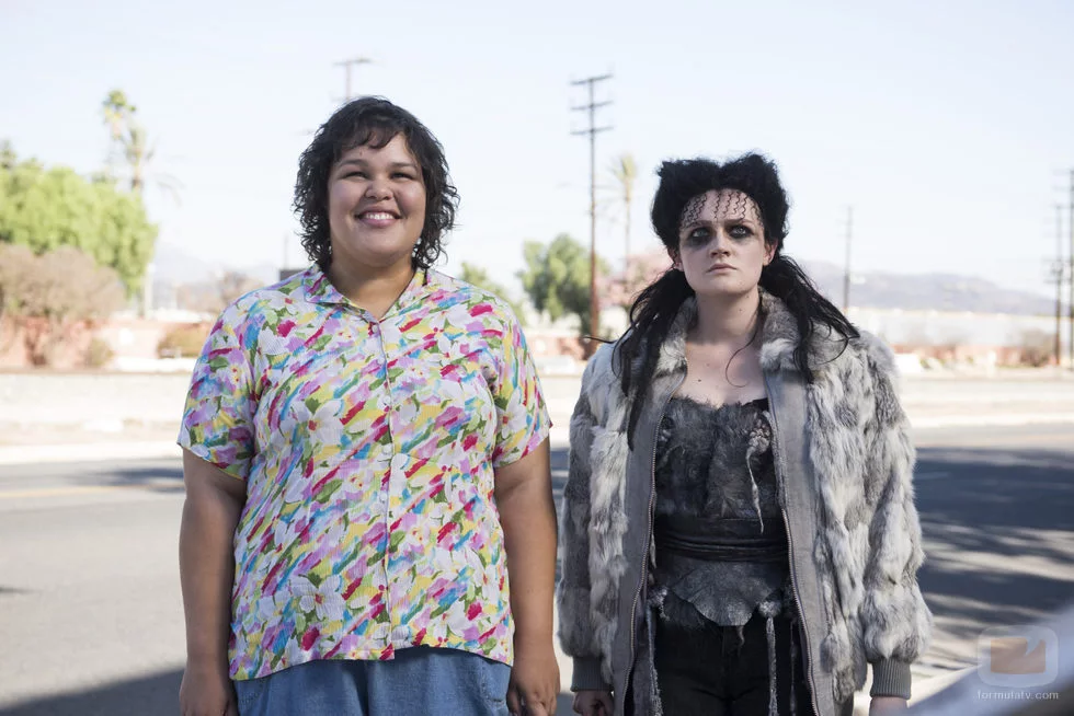 Britney Young y Gayle Rankin en el cuarto episodio de la primera temporada, en la que se encuentran mirando al frente una con cara serie y otra sonriendo.