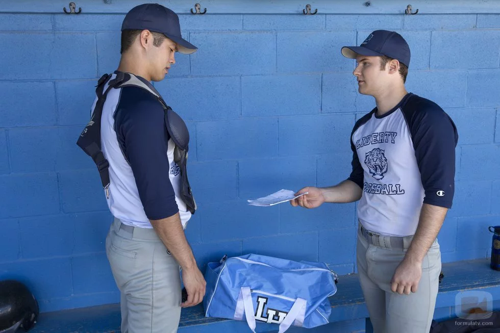 Bryce, interpretado por Justin Prentice, entrega un papel con algo escrito a Zach en el banquillo del equipo durante la segunda temporada de 'Por 13 razones'.