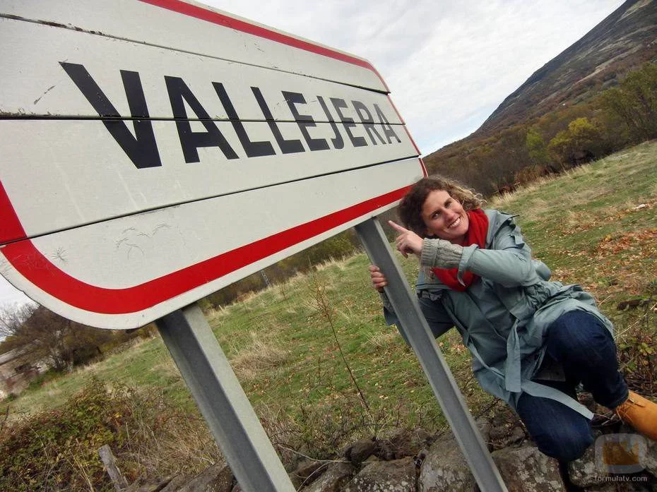 Sofía Colombo, la presentadora, junto a la señal de entrada a Valleja.