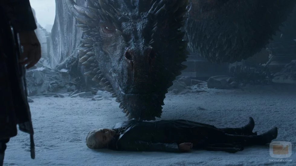El único dragón de entre los criados por Daenerys que sobrevive hasta el final de la serie observa a su madre muerta ante su asesino.