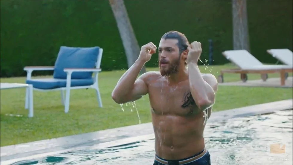 Can Yaman sale de la piscina con el torso desnudo