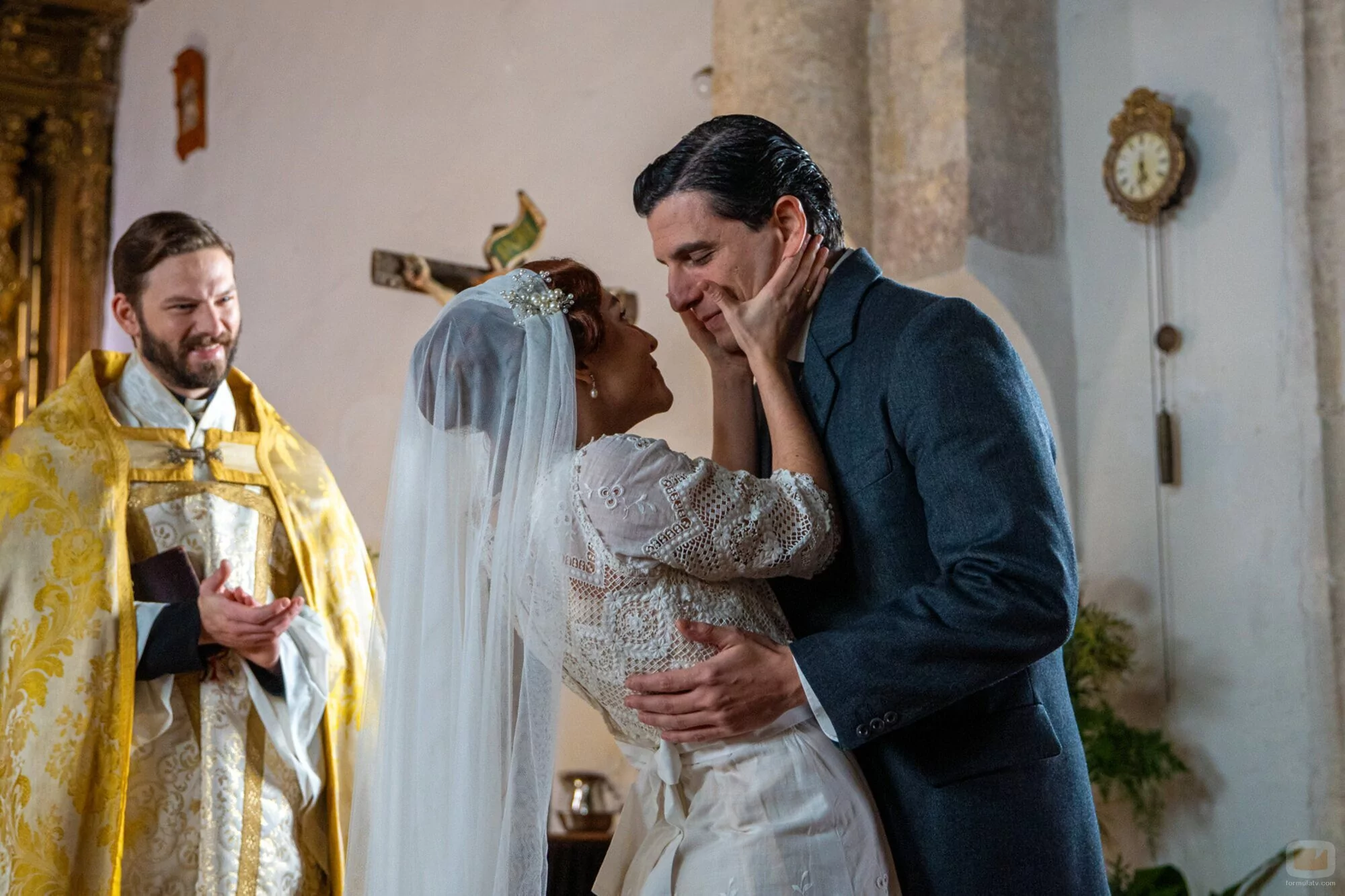 Daniel Schröder, Sara Font y Álvaro Quintana aparecen en una imagen promocional del episodio 'Jueves 19 de febrero de 2026' de la serie 'La Promessa'.