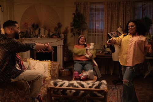 Liza Treyger, Michelle Buteau y Tone Bell aparecen en una foto promocional del capítulo 1x06 de la serie 'La supervivencia de una chica con curvas'.