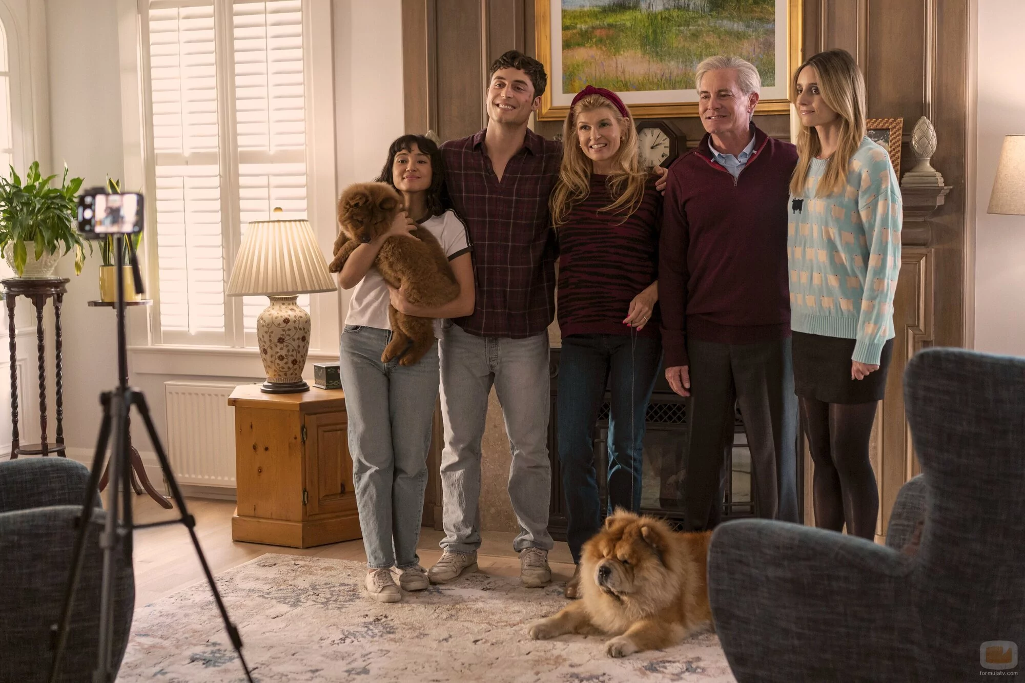Connie Britton, Wally Baram, Mary Beth Barone, Benito Skinner y Kyle MacLachlan aparecen en una escena promocional del episodio 'Bienvenidos al desfile negro' de 'Overcompensating'.