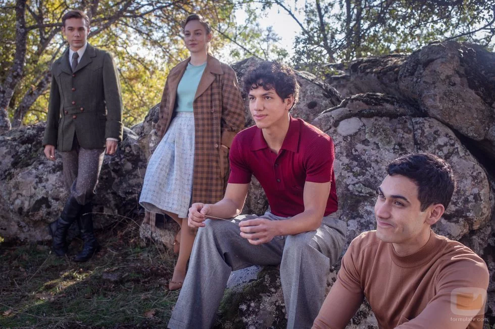 Alonso (Carlos Cuevas), Cayetana (Ester Expósito), Lázaro (Isaac Hernández) y Gabino (Alejandro Speitzer), juntos en el campo en una escena de 'Alguien tiene que morir'.