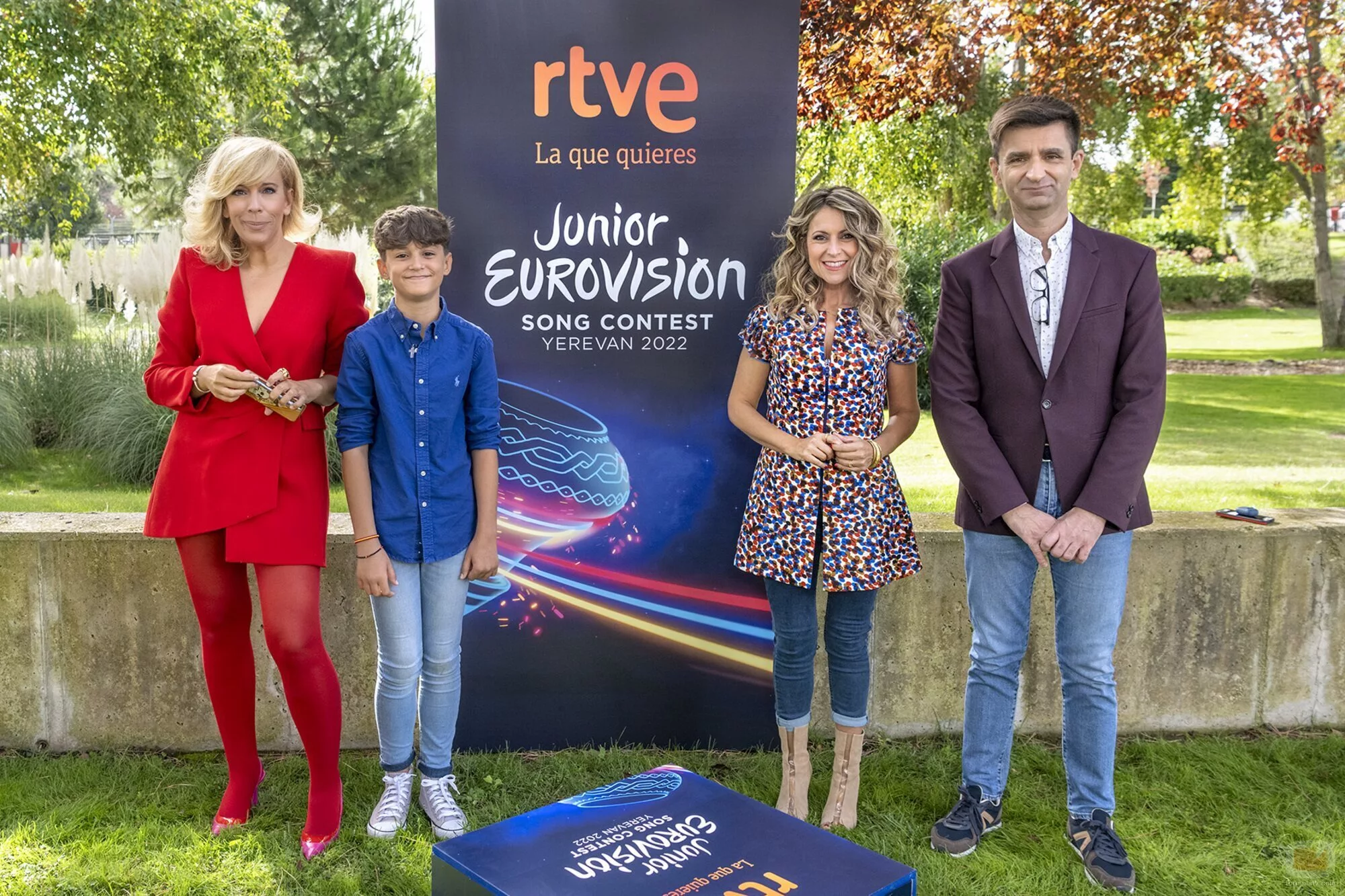 María Eizaguirre, Carlos Higes, Eva Mora y José Pablo López, posando en la primera rueda de prensa de Eurovisión Junior 2022.