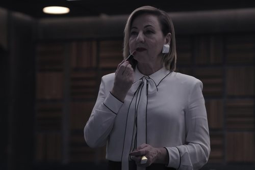 La actriz Carmen Machi se pinta las labios en la sala de interrogatorios de 'Criminal', la coproducción internacional de Netflix.