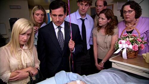 Jenna Fischer, Brian Baumgartner, John Krasinski, Phyllis Smith, Steve Carell y Angela Kinsey aparecen en una escena del episodio 4x01 de la serie 'The Office'.