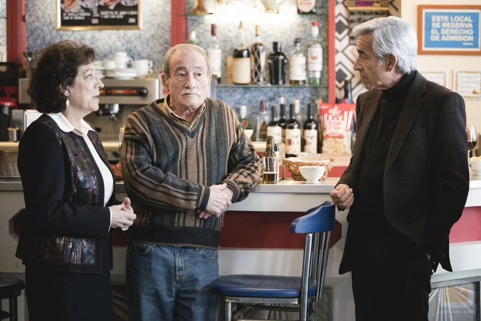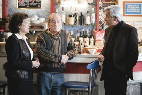 Casandra (Carmen Balagué), Ramón (Manolo Cal) y Antonio Alcántara (Imanol Arias) conversan en el Bistró en el 20x09 de 'Cuéntame cómo pasó'.