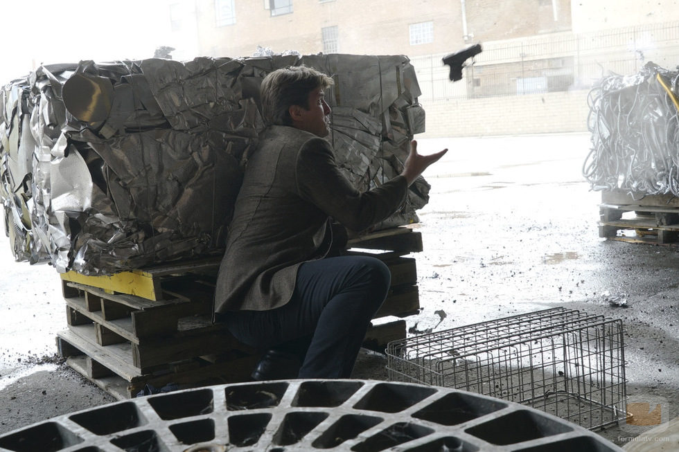 (8x22) Castle (Nathan Fillion) trata de atrapar una pistola al vuelo en el último episodio de la octava temporada de 'Castle'.