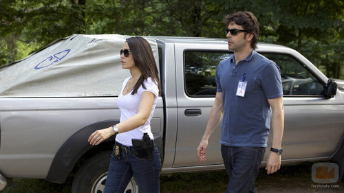 La agente Eva Hernández con la ayuda de Tomás Soller investigan sobre el terreno.