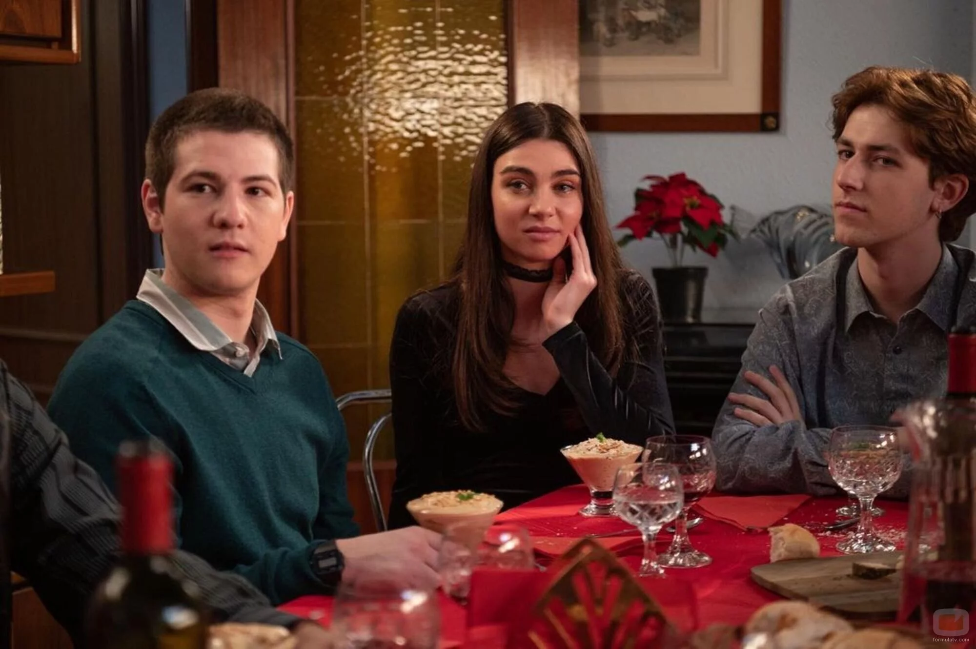 Oriol (Álvaro Díaz), María (Carmen Climent) y Santi (Asier Valdestilla) en una cena familiar del episodio 23x01 de la serie de Grupo Ganga.