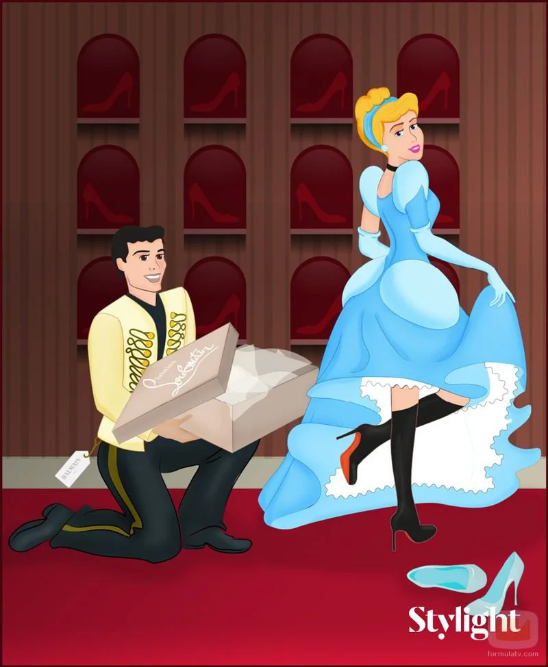 Cenicienta cambia la incomodidad de llevar zapatos de cristal por unos Louboutin que le ha regalado el príncipe por San Valentín.