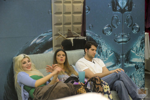 Los concursantes de 'Gran Hermano Vip' Charlotte, Laura y Julián sentados y relajados en un sofá de la casa del concurso.