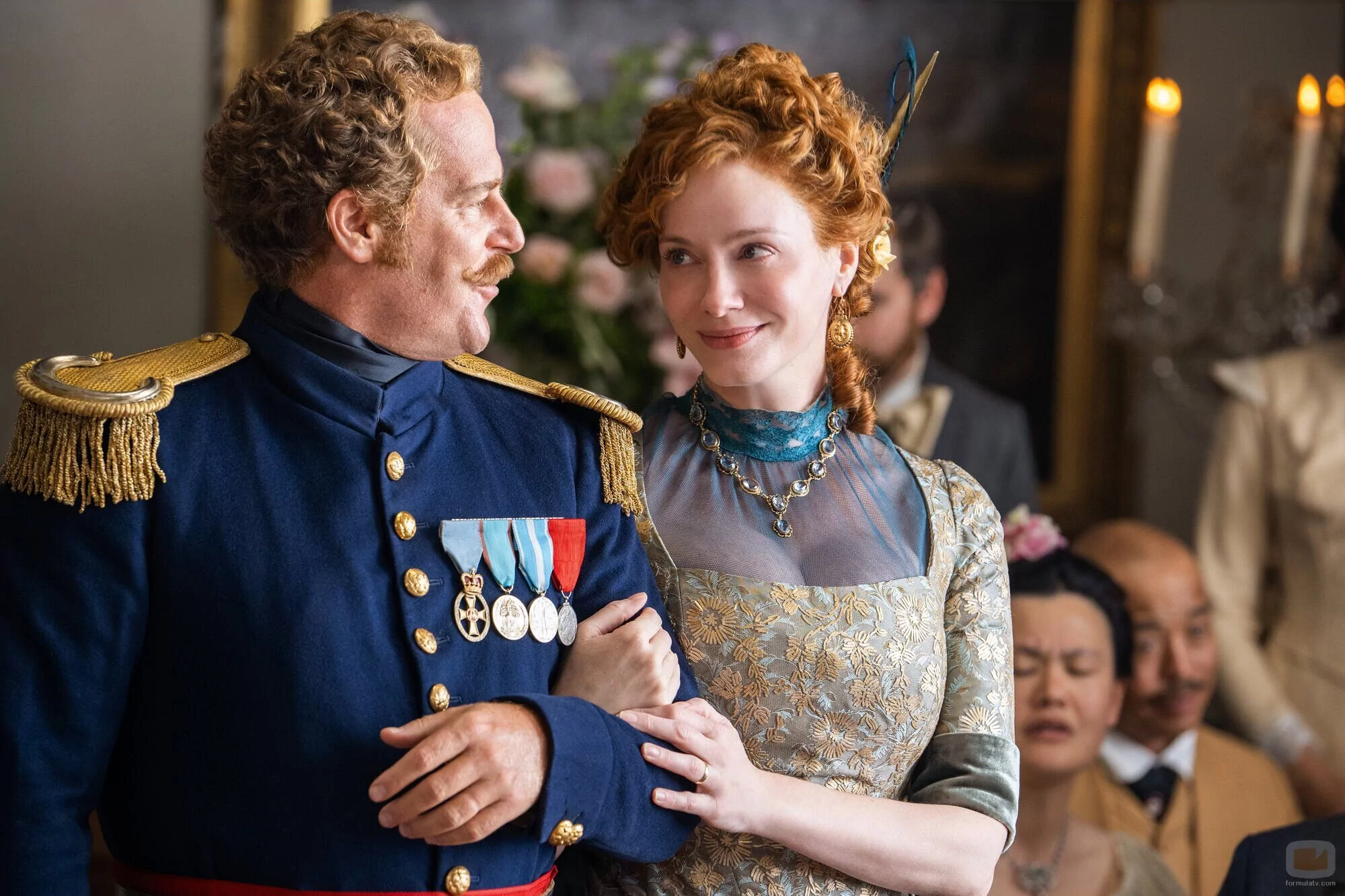 Christina Hendricks y Adam James en 1x01 titulado 'El Veneno Norteamericano' de 'The Buccaneers: Aristócratas por amor'