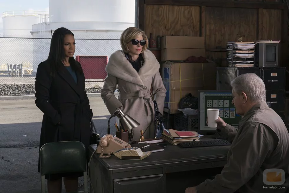 Diane Lockhart y Liz Lawrence, personajes de las actrices, hablan con un hombre en una escena de la nueva temporada de 'The Good Fight'.